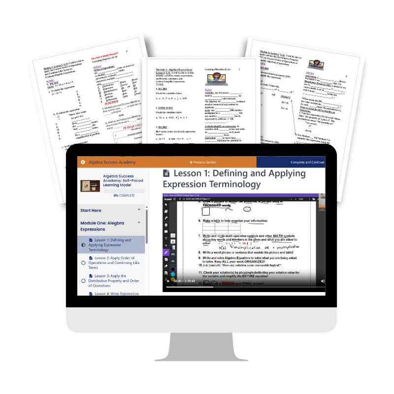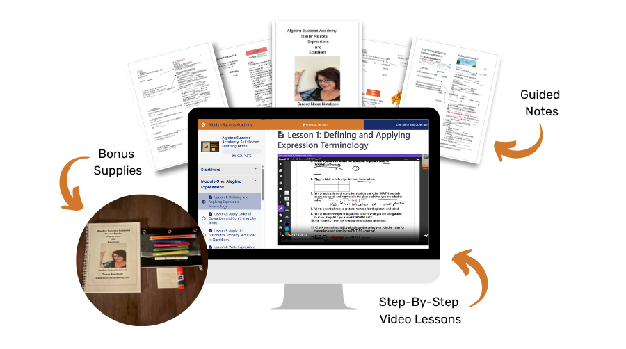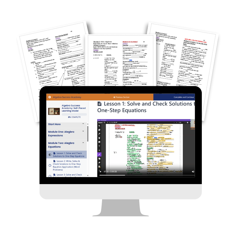Your child will work through the entire Algebra Success Academy curriculum using pre-recorded video lessons and a guided notes workbook.
